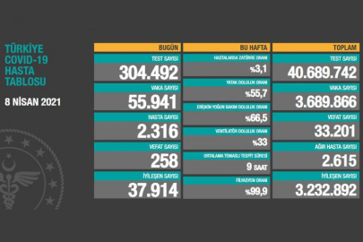 Türkiye'de son 24 saatte 304 bin 492 Kovid-19 testi yapıldı, 55 bin 941 kişinin testi pozitif çıktı, 258 kişi hayatını kaybetti.
