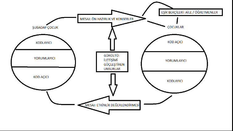 İletişim modeli karşılıklı etkileşim üzerine kurulu. Şubadap’ın mesajı olan ön hazırlık ve konserler çocuklara doğrudan ulaşıyor ya da eşik bekçileri olan aile/öğretmen süzgecinden geçerek ulaşıyor. Eşik bekçileri olan kişilerin görevi hangi bilgilerin ne ölçüde ve ne şekilde çocuklara ulaşacağını belirlemek oluyor. Bu sebeple ön hazırlık süreçlerinin iyi kurgulanmış olması (Eğitimciler İçin Şubadap Çocuk Etkinlik Kitabı vb.) ya da etkinlik sonrası öğretmenlerle toplantı yapılması mesajların ulaşmasında geçişkenliği artırıyor. Çocuklar bu aracılar üzerinden ya da doğrudan onlara iletilen bilgileri ve mesajları (iletişim modelinde “kodlar” olarak geçecek) alıyor (kod açıyor), yorumluyor ve bize verecekleri geri dönüşleri (çizdikleri resimler, yazdıkları mektuplar vb.) yeniden kodluyorlar. Yani bize etkinlik değerlendirmelerini iletiyorlar. Biz de onların kodunu açma, yorumlama ve sıradaki üretimlerimizi buna göre gerçekleştirme (kodlama) imkânına sahibiz. Etkinlik değerlendirme metinlerinin incelenmesi bu yüzden önemli, gelecek üretimlerin niteliği aldığımız geri dönüşlere göre pozisyon almamıza bağlı olabilir.