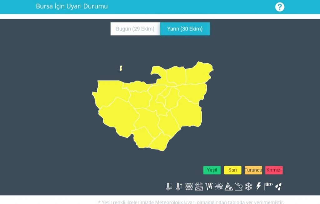 Bursa'da yarın için sağanak ve yer yer gök gürültülü sağanak yağış beklendiğini açıklayan Meteoroloji, 30 Ekim Cuma günü saat 12.00'den 23.59'a kadar 'sarı' uyarı yayımladı.