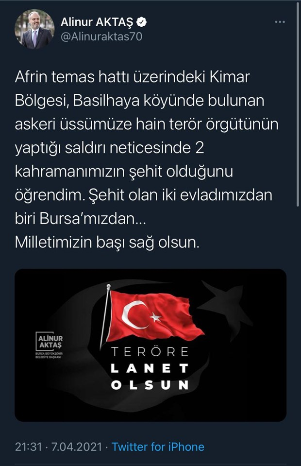 "Afrin temas hattı üzerindeki Kimar Bölgesi, Basilhaya köyünde bulunan askeri üssümüze hain terör örgütünün yaptığı saldırı neticesinde 2 kahramanımızın şehit olduğunu öğrendim. Şehit olan iki evladımızdan biri Bursa’mızdan... Milletimizin başı sağ olsun."