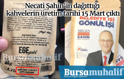 AKP Nilüfer Belediye Başkan Adayı Necati Şahin'in seçim çalışmaları için dağıttığı kahvelerin arkasında yazan üretim tarihinin 15 Mart 2019 olduğu ortaya çıktı. Türkiye'de yolsuzluk ve rantın iktidarı olan AKP'nin Nilüfer Belediye Başkan Adayı'nın promosyonları bile şaibeli.
