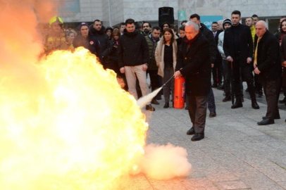 Başarılı şekilde gerçekleşen bina tahliyesinin ardından açık alanda kuru kimyevi tozla yangın söndürme tatbikatı yapıldı. Konuyla ilgili bilgilendirmenin ardından bina dışında uygulama gerçekleştirildi. Başkan Şadi Özdemir de yangın söndürme uygulaması yapanlar arasında yer aldı.