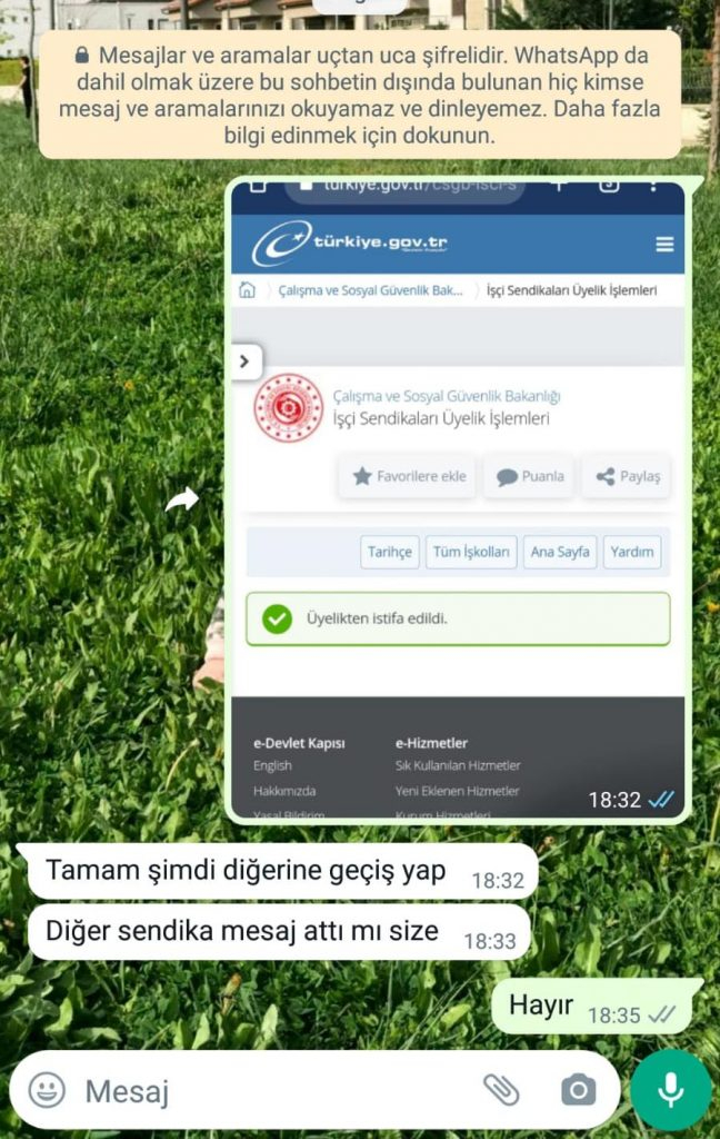 Ali Aykan Güleryüz’ün bir işçiyle konuşmasında sendikadan istifa ettiğinin mesajına karşılık “Tamam şimdi diğerine geçiş yap” şeklinde verdiği cevap, amirler tarafından işçilere yönelik sendika değiştirme baskısını da kanıtlamış oldu.