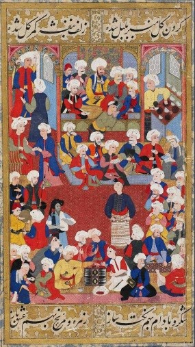 Evliya Çelebi, Ulucami’nin yanındaki bugünkü hac malzemeleri satılan yerde, dönemin Emir Kahvehanesi’nde hanendeler, sazendeler, rakkaslar ve mahbublardan bahsediyor. “Mahbub Cihan Rakkas” diyerek “Dünya Güzeli Rakkaslar”ın kahvehanede olduğundan söz ediyor.