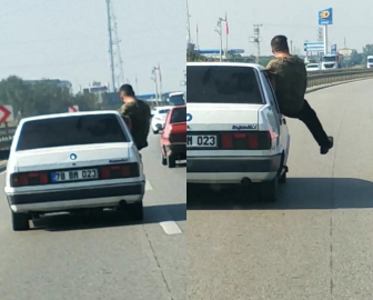 Bursa- Karacabey yolunda, 78 BM 023 plakalı otomobilin ön yolcu koltuğundaki camından aşağı sarkılan kimliği henüz belirlenemeyen bir kişi, sağ elini ve sağ ayağını dışarıya sarkıtarak yolculuk yaptı. Kendisini ve çevredeki tehlikeye atan kişi yaptığı farklı hareketlerle yürekleri ağza getirdi. Diğer sürücülerin tepkilerine aldırmadan davranışlarına devam eden kişi bir başka sürücünün cep telefonu kamerasına yansıdı.