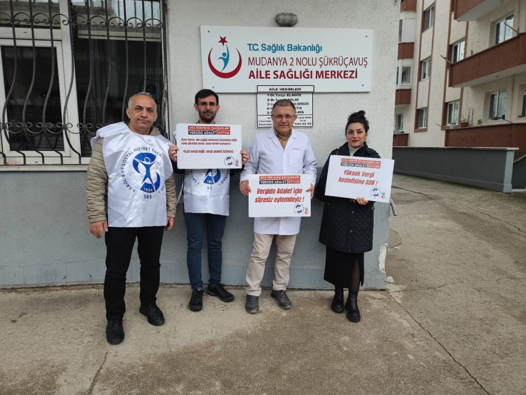 Açıklamanın devamında şu ifadeler yer aldı, “Birinci basamak sağlık hizmetlerinde koruyucu sağlık hizmetlerinden uzaklaşan, tedavi edici hekimliğe teşvik eden performans uygulamaları ile halkın kaynakları ilaç ve medikal şirketlerin cebine giderken sağlık çalışanlarının hak ettiği ücretler gündeme gelince yeterli parasal kaynağımız yok deyip kamuoyu yanıltılıyor. Daha yılın ikinci ücret ödemesinde vergi dilimi artışı ile geliri düşürülen biz Aile Hekimliği çalışanları olarak, ‘Vergide Adalet İstiyoruz’ eylemelerimizi talebimiz gerçekleşene dek her hafta Çarşamba günleri süresiz sürdüreceğiz. SES ve TTB’nin birlikte başlattığı 14 Mart için 14 talebinden biri olan vergi adaletinin sağlanması vergi kesintilerinin her ay sabit kalması ve en fazla %15 olması için sürdürdüğümüz mücadeleye halkımızın ve kamuoyunun desteğini bekliyoruz.”