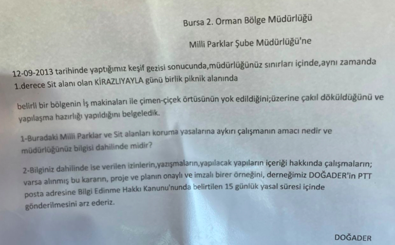 Bu arada DOĞADER, bölgede yapılanlarla ilgili bilgi edinmek için resmi başvuruda bulunmuştu.