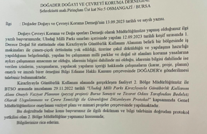 Uludağ Milli Park Müdürlüğü tarafından DOĞADER'e verilen yanıtta 2. Bölge Müdürlüğü ile BTSO arasında protokol imzalandığı belirtildi ve soruların yanıtları için 2. Bölge Müdürlüğü işaret edildi.