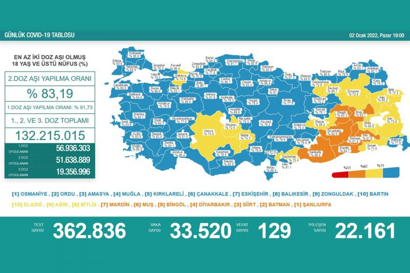 Türkiye'de son 24 saatte 362 bin 836 Kovid-19 testi yapıldı, 33 bin 520 yeni vaka tespit edildi, 129 kişi yaşamını yitirdi.