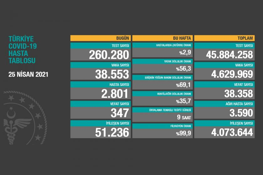 Sağlık Bakanlığının açıkladığı verilere göre son 24 saatte 38 bin 553 yeni Kovid-19 vakası tespit edildi. 347 kişi koronavirüsten hayatını kaybederken hasta sayısına 2 bin 801 kişi eklendi, ağır hasta sayısı ise 3 bin 590 oldu.