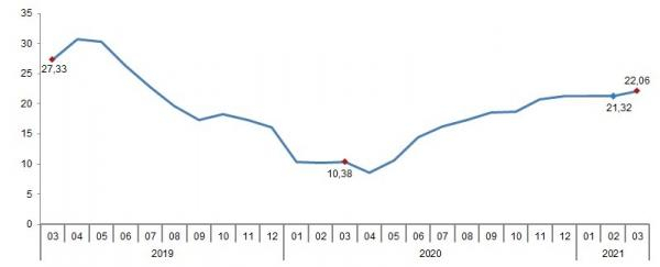 Buna göre, söz konusu endekste martta bir önceki aya göre yüzde 2,52, geçen yılın aralık ayına göre yüzde 8,39, geçen yılın aynı ayına göre yüzde 22,06 ve 12 aylık ortalamalara göre yüzde 17,68 artış gerçekleşti.