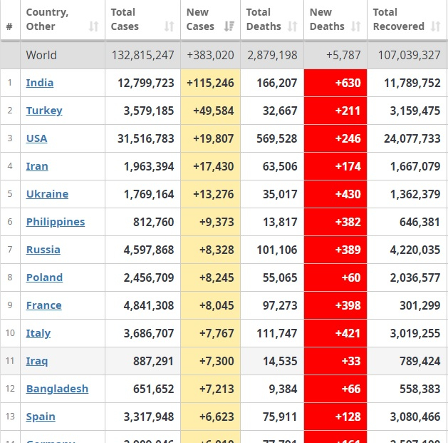 Günlük vaka sayısının 115 bin 246 olduğu Hindistan ise, dünya genelinde birinci sırada yer aldı. Sıralamada Hindistan ve Türkiye'nin ardından 3. sırada ise 19 bin 807 vaka ile ABD yer aldı. ABD'yi İran ve Ukrayna takip etti.