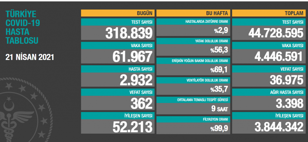 Türkiye'de son 24 saatte 318 bin 839 Kovid-19 testi yapıldı, 61 bin 967 kişinin testi pozitif çıktı, 362 kişi hayatını kaybetti.