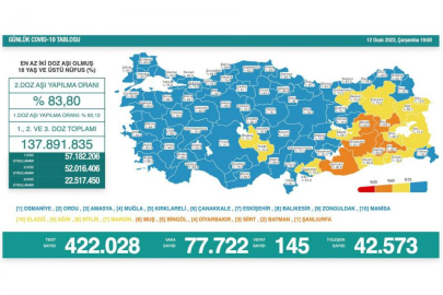Türkiye'de son 24 saatte 422 bin 28 Kovid-19 testi yapıldı, 77 bin 722 kişinin testi pozitif çıktı, 145 kişi yaşamını yitirdi.