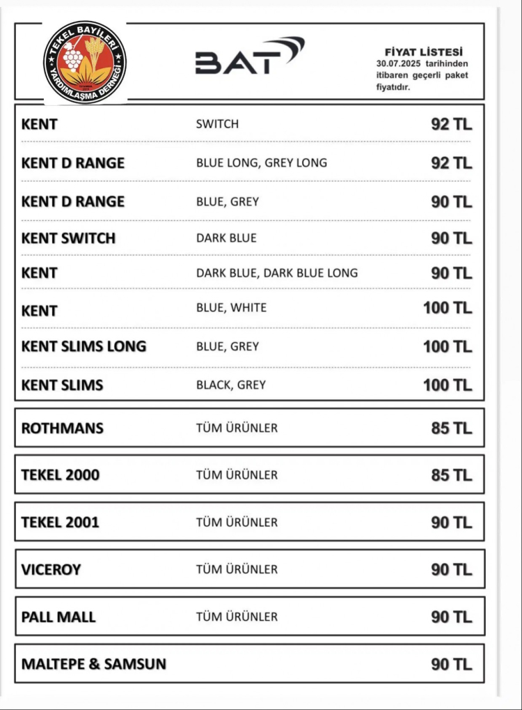 Tekel Bayileri Yardımlaşma Derneği (TBYD) Başkanı Erol Dündar, sosyal medya hesabından yaptığı açıklamayla BAT grubuna yapılan zammı duyurdu. Açıklamaya göre, zam sonrası BAT grubundaki en ucuz sigaranın fiyatı 85 TL’ye, en pahalı sigaranın fiyatı ise 100 TL’ye yükseldi.