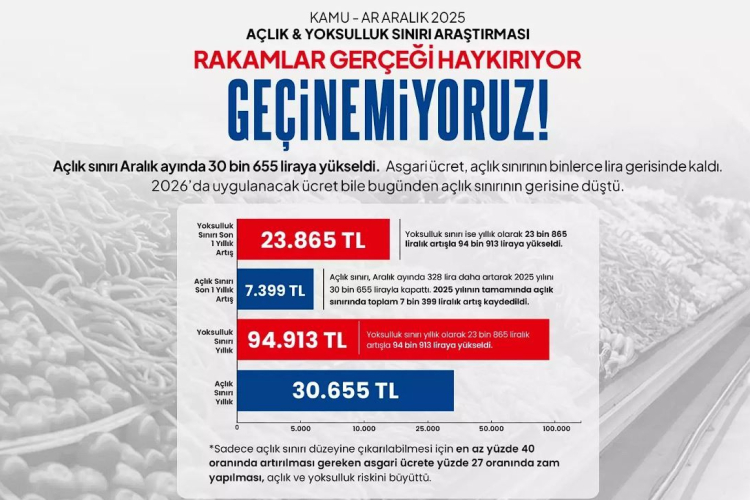 Birleşik Kamu-İş Konfederasyonu Ar-Ge birimi KAMU-AR’ın Aralık 2025 Açlık ve Yoksulluk Sınırı Araştırması’na göre, dört kişilik bir ailenin yalnızca sağlıklı ve dengeli beslenebilmesi için yapması gereken aylık gıda harcaması bir önceki aya göre 328 lira artarak 30 bin 655 liraya çıktı. Gıda dışı harcamalardaki artışla birlikte yoksulluk sınırı ise 94 bin 913 liraya yükseldi.