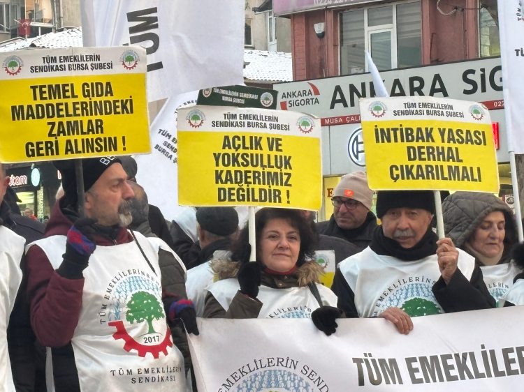 Emekli maaşlarının açıklanması beklenirken Tüm Emekliler Sendikası Bursa Şubesi, Fomara Meydanı'nda derinleşen yoksulluğa dikkat çekmek amacıyla basın açıklaması yaptı. Yapılan açıklamayı şube başkanı Gülçin Ayyılmaz okudu.