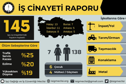 İşçi Sağlığı ve İş Güvenliği Meclisi (İSİG), Mart 2025 İş Cinayeti Raporunu açıkladı. Rapora göre, mart ayında 145 işçi iş cinayeti sonucu hayatını kaybetti.