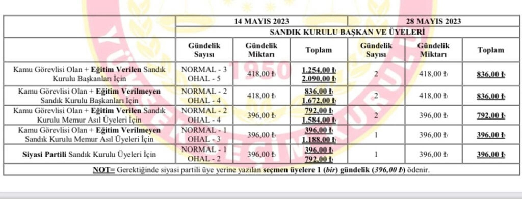 Türkiye adım adım 14 Mayıs seçimlerine gidiyor. Seçimlerde sandık başındaki görevlilere verilecek ücret belli oldu. Görevli memurlar 396 lira ödeme yapılacak. 2019'da sandık görevlilerine verilen ücret 261 liraydı.