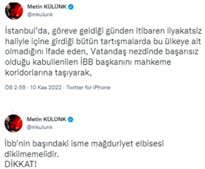 Dava öncesi AKP MKYK üyesi Metin Külünk, Twitter hesabından yaptığı paylaşımlarla "İmamoğlu'nun mağdur edilerek kahraman haline getirilmemesini" istedi.
