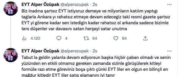 Özüpak'ın, "Biz inadına şartsız EYT istiyoruz demeye ve milyonların katılım yaptıgı taglarla Ankara yı rahatsız etmeye devam edecegiz taki resmi gazete şartsız EYT yi görene kadar sen istedigin kadar rahatsız ol arkanda sadece bizimle ters düşenler var davasını satan herşeyi satar unutma" paylaşımı ile, "Tabut la geldin yalanla devam ediyorsun başka hiçbir çaban olmadı ve senin yüzünden en etkili olmamız gereken zamanda sizinle görüşülerek kitleyi formüle razı etme göreviniz boşa çıktı çünki EYT liler en olgun en bilinçli en mağdur kitledir EYT liler satış elamanını iyi tanır" paylaşımı da dikkat çekti.