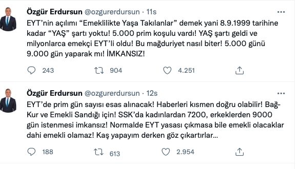 EYT’nin açılımı “Emeklilikte Yaşa Takılanlar” demek yani 8.9.1999 tarihine kadar “YAŞ” şartı yoktu! 5.000 prim koşulu vardı! YAŞ şartı geldi ve milyonlarca emekçi EYT’li oldu! Bu mağduriyet nasıl biter! 5.000 günü 9.000 gün yaparak mı! İMKANSIZ!"