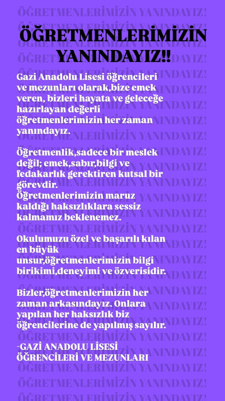 Gazi Anadolu Lisesi öğrencileri yayınladığı mesajda, "Öğretmenlik sadece bir meslek değil; emek, sabır, bilgi ve fedakarlık gerektiren kutsal bir görevdir" ifadelerine yer verilerek, öğretmenlerinin yanında olduklarını ifade etti.