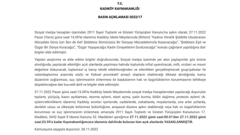 Kaymakamlık tarafından yapılan açıklamada "27.11.2022 Pazar günü saat: 15.00’te Kadıköy İskele Meydanında sosyal medya hesaplarından yapılacağı duyurulan toplantı, yürüyüş, basın açıklaması, oturma eylemi, stant açma, çadır kurma, bildiri dağıtma, protesto eylemi vb. eylem/etkinliklerin idaremiz Kadıköy sınırları içerisinde; caddelerde, sokaklarda, meydanlarda, ana arter yollarda, devletin ulusu ve ülkesiyle bölünmez bütünlüğüne, anayasal düzene aykırı olabileceği veya hak ve özgürlüklerinin korunması ve suç işlenmesinin önlenmesi amacıyla 2911 Sayılı Toplantı ve Gösteri Yürüyüşleri Kanununun 17. Maddesi, 5442 Sayılı İl İdaresi Kanunu 32. Maddeleri gereğince 27.11.2022 günü saat:00.01’den 27.11.2022 günü saat:23.59’a kadar Kaymakamlığımızca idaremiz dahilinde bulunan tüm açık alanlarda YASAKLANMIŞTIR." denildi.