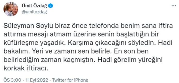 “Süleyman Soylu biraz önce telefonda benim sana iftira attırma mesajı atmam üzerine senin başlattığın bir küfürleşme yaşadık. Karşıma çıkacağını söyledin. Hadi bakalım. Yeri ve zamanı sen belirle. En son ben belirlediğim zaman kaçmıştın. Hadi görelim yüreğini korkak iftiracı.”