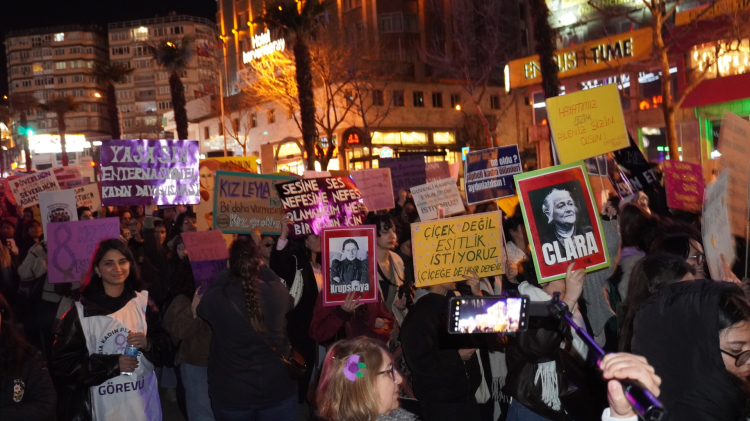Fomara Meydanı’nda toplanan kadınlar daha sonra “Kadınlar yürüyor, mücadele büyüyor” sloganlarıyla Kent Meydanı’na yürüyüşe geçti. Yürüyüş sırasında kadınların önüne polis barikatı kurulurken, kadınlar sloganlarla tepkilerini dile getirerek yürüyüşlerini sürdürdü ve Kent Meydanı’na doğru yürüdü.