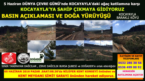 DOĞADER, Sınır Tanımayan Dağcılar ve Zirve Dağcılık Bursa Şubesi'nin ortaklaşa düzenleyeceği etkinlik Uludağ'daki rant amaçlı ağaç katliamına dikkat çekecek. Geçtiğimiz ay gündeme getirilen ve binlerce ağacın kesilerek talan edildiği bölgeye yapılacak yürüyüşte aynı zamanda Kocayayla bölgesinde bir de basın açıklaması gerçekleştirilecek.