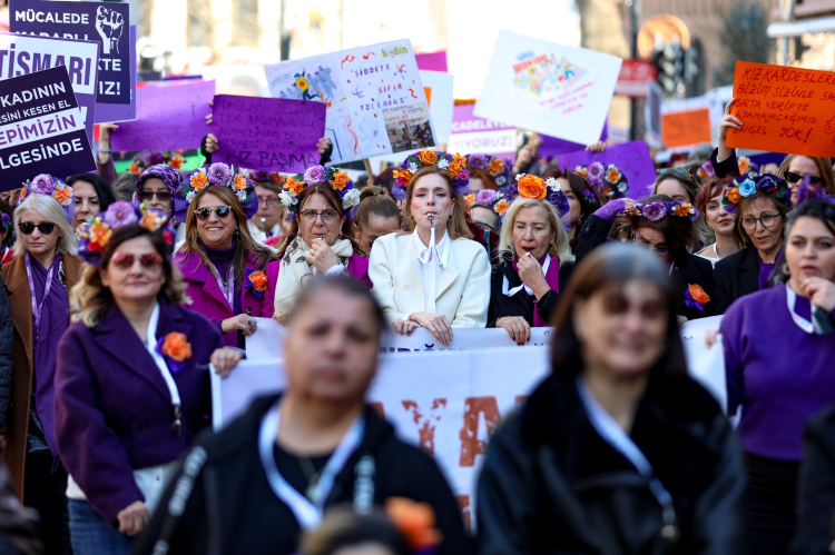 Cumhuriyet Caddesi’nden Hanlar Bölgesi’ne kadar yürüyen Bursalı kadınlar, 8 Mart Dünya Emekçi Kadınlar Günü etkinlikleri kapsamında ‘Saklandığımız değil, Buluştuğumuz yerdeyiz. Biz birbirimizin çaresiyiz’ mesajını verdi. Ellerinde ‘İstismarı aklama! Asla yalnız yürümeyeceksin!’ yazılı döviz, afiş ve pankartlar taşıyan kadınlar, ‘Yaşasın kadın dayanışması’ sloganları atarak görünmez kılınmalarına, emeklerinin değersizleştirilmesine, şiddete ve ayrımcılığa karşı dayanışma mesajı verildi.