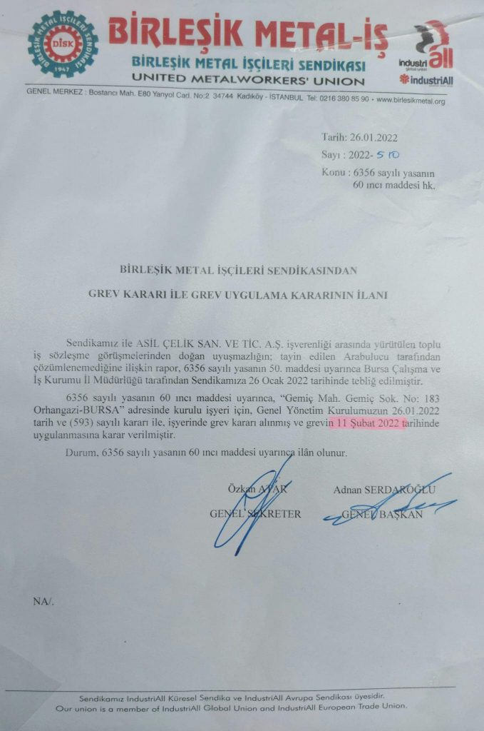 Orhangazi’de faaliyet gösteren Asil Çelik fabrikasında örgütlü olan Birleşik Metal-İş Sendikası ile patron arasında devam eden toplu iş görüşmelerinde anlaşma sağlanmasının ardından fabrikaya grev kararı asıldı.