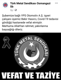 Türk Metal Sendikası Osmangazi Şubesi sosyal medya hesabından, “Şubemize bağlı YPS Otomotiv A.Ş. işyeri çalışanı üyemiz Bekir Hasırcı, Covid-19 tedavisi gördüğü hastanede vefat etmiştir” denildi.