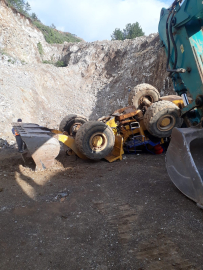 Harmancık'ta manyazit mermer faaliyeti yürüten bir firmaya ait yükleme makinesi sabah 9.30 sularında uçurumdan yuvarlandı. İş makinesi operatörü olan 69 yaşındaki Halil Bakar isimli işçi makinenin devrilmesi sonucu hayatını kaybetti.