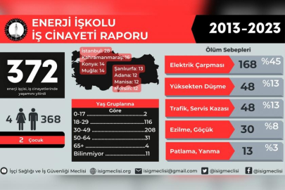 İşçi Sağlığı ve İş Güvenliği (İSİG) Meclisi enerji işkolundaki cinayetlere dikkat çekmek için rapor hazırladı. Rapora göre, 2013 yılında 33 işçi, 2014 yılında 31 işçi, 2015 yılında 39 işçi, 2016 yılında 35 işçi, 2017 yılında 49 işçi, 2018 yılında 10 işçi, 2019 yılında 40 işçi, 2020 yılında 41 işçi, 2021 yılında 32 işçi, 2022 yılında 42 işçi ve 2023 yılının ilk sekiz ayında 20 işçi olmak üzere; 2013 yılından bugüne “en az” 372 enerji işçisi “iş cinayetleri”nde hayatını kaybetti. Enerji işkolunda iş cinayetlerinde ölenlerin 19’u (yüzde 5,1) sendikalı işçi, 353’ü ise (yüzde 94,9) sendikasız.