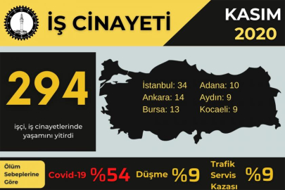İşçi Sağlığı ve İş Güvenliği Meclisi (İSİG) tarafından açıklanan rapora göre Kasım ayında en az 294 işçi, iş cinayetlerinde hayatını kaybetti. 2020'nin on bir ayında ise en az 2032 işçi yaşamını yitirdi. En fazla ölüm nedeni Covid-19 oldu. İSİG, salgınla beraber işçi sınıfının ölüm ve açlık kıskacı altında olduğunu belirtti.