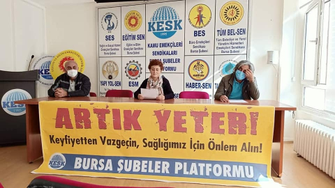 KESK Bursa ortak salonunda yapılan açıklamada konuşan dönem sözcüsü Nuriye Aydemir; “Sağlık Bakanı Fahrettin Koca'nın sözlerinin hatırlatıldığı açıklamada, "Kamu hizmetinin devamı bizlerin sağlıklı kalması ile mümkün olabilecektir. Ancak vakaların kat kat arttığı ilimizde kurumlarımızda yeterli önlemler alınmamakta, göstermelik alınan tedbirler söylemleriyle uyuşmamaktadır. Salgının başından beri söylediğimiz gibi alınacak önlemlerde Türk Tabipler Birliği Covid-19 izleme rehberleri ve Dünya Sağlık Örgütünün uyarıları dikkate alınarak hayata geçirilmesi benimsenmelidir. Kurumlarımızın çoğunda dönüşümlü ve esnek çalışma tedbirleri kaldırılmıştır." denildi.