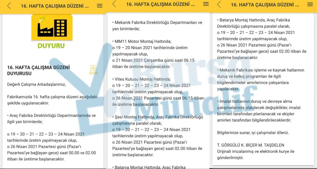 Fabrika yönetimi tarafından işçilere yapılan bilgilendirmede duruş tarihleri yer alırken, değişiklik olduğu taktirde amirler tarafından bilgilendirme yapılacağı kaydedildi.