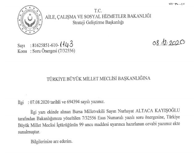 Aile , Çalışma ve Sosyal Hizmetler Bakanı Zehra Zümrüt Selçuk, Milletvekili Altaca'nın verdiği soru önergesine cevap verdi.