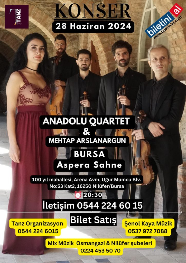 Oda müziği formundaki repertuvarıyla; Âşık Veysel'den Aram Tigran'a, Gomidas'tan Neşet Ertaş'a uzanan halk ozanlarının eserleri, Anadolu halklarının anonim ezgileri, etnik dünya müzikleri ve film müzikleri olan Anadolu Quartet & Mehtap Arslanargun 28 Haziran Cuma günü Bursa Aspera Sahne’de dinleyicileriyle buluşacak.