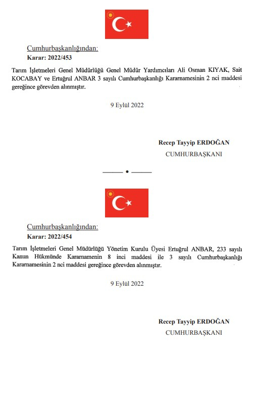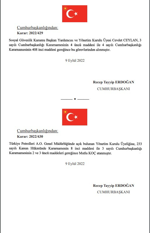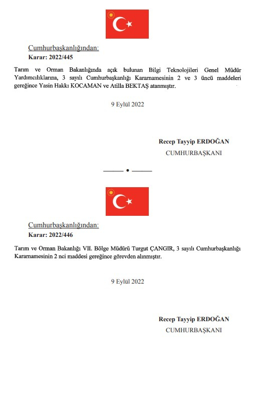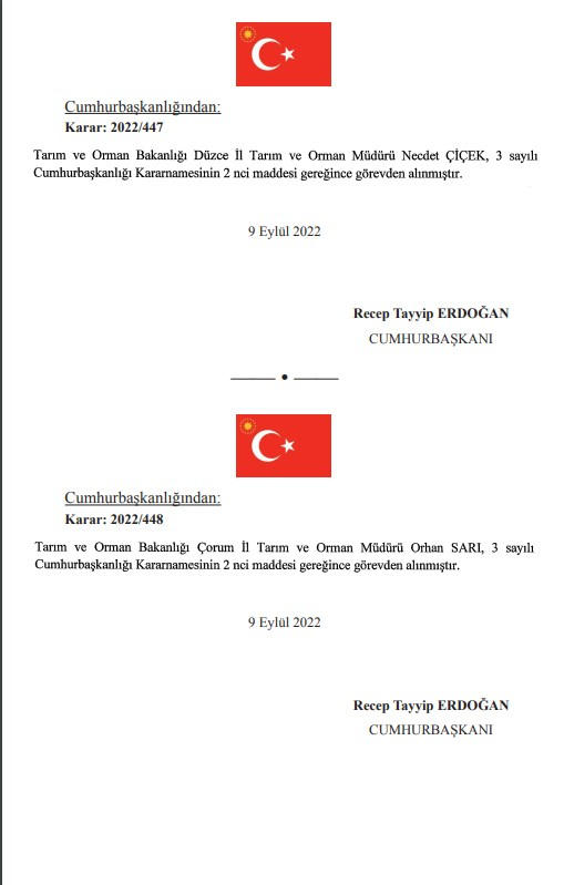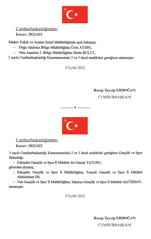 AKP'li Cumhurbaşkanı Tayyip Erdoğan'ın imzasını taşıyan atama ve görevden alma kararları Resmi Gazete'de yayımlandı.
