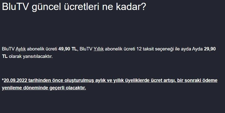Dijital yayın platformu BluTV'nin abonelik ücretlerine zam geldi. 20 Eylül 2022'den önce oluşturulmuş aylık ve yıllık üyeliklerde ücret artışı, bir sonraki ödeme yenileme döneminde geçerli olacak.