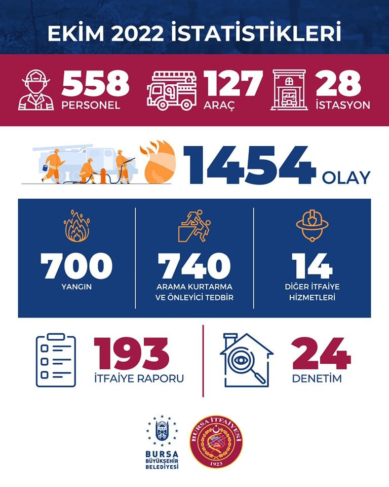 Bursa’da 28 istasyonda 558 personel, 127 araçla hizmet veren Büyükşehir Belediyesi İtfaiye Daire Başkanlığı’na bağlı ekipler, ekim ayında 700 yangın, 740 arama kurtarma ve önleyici tedbir, 14 diğer itfaiye hizmetleri olmak üzere bin 454 olaya müdahale etti.