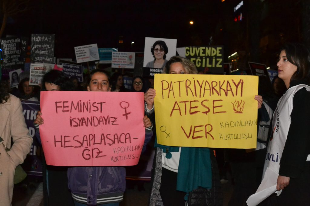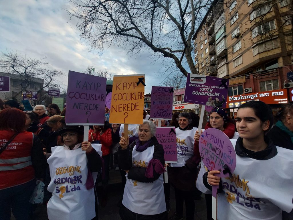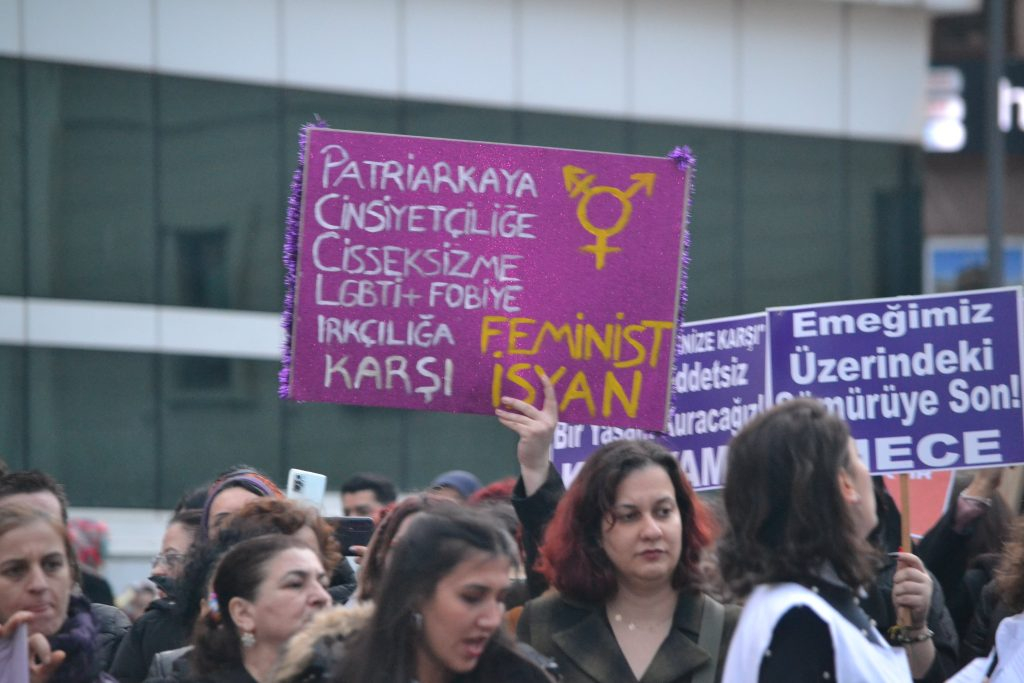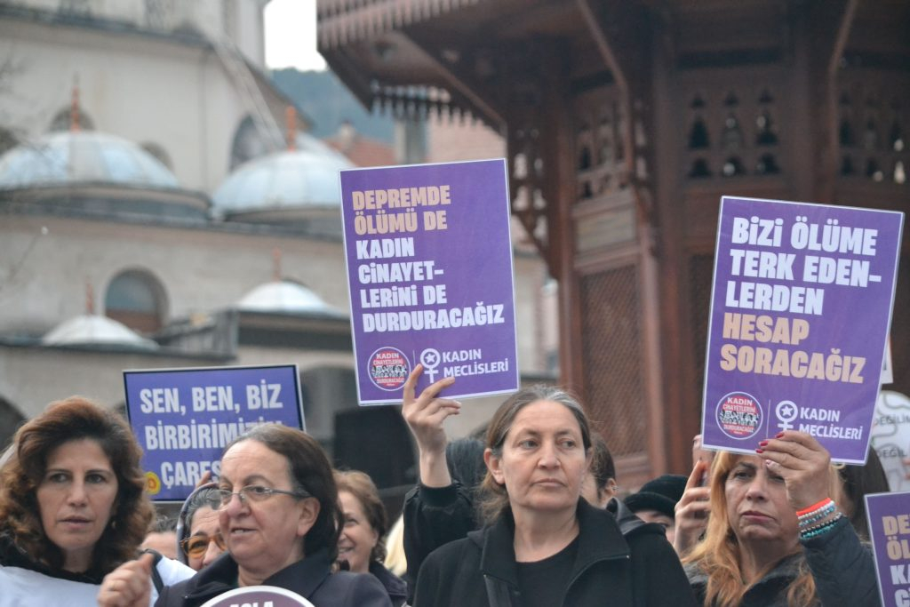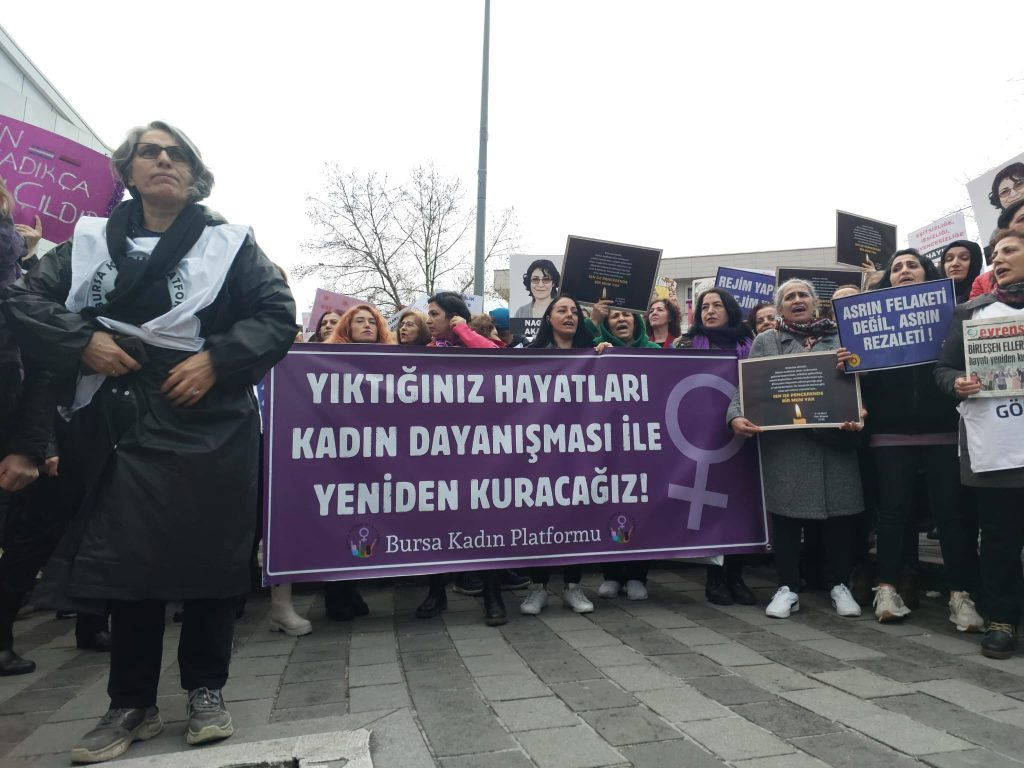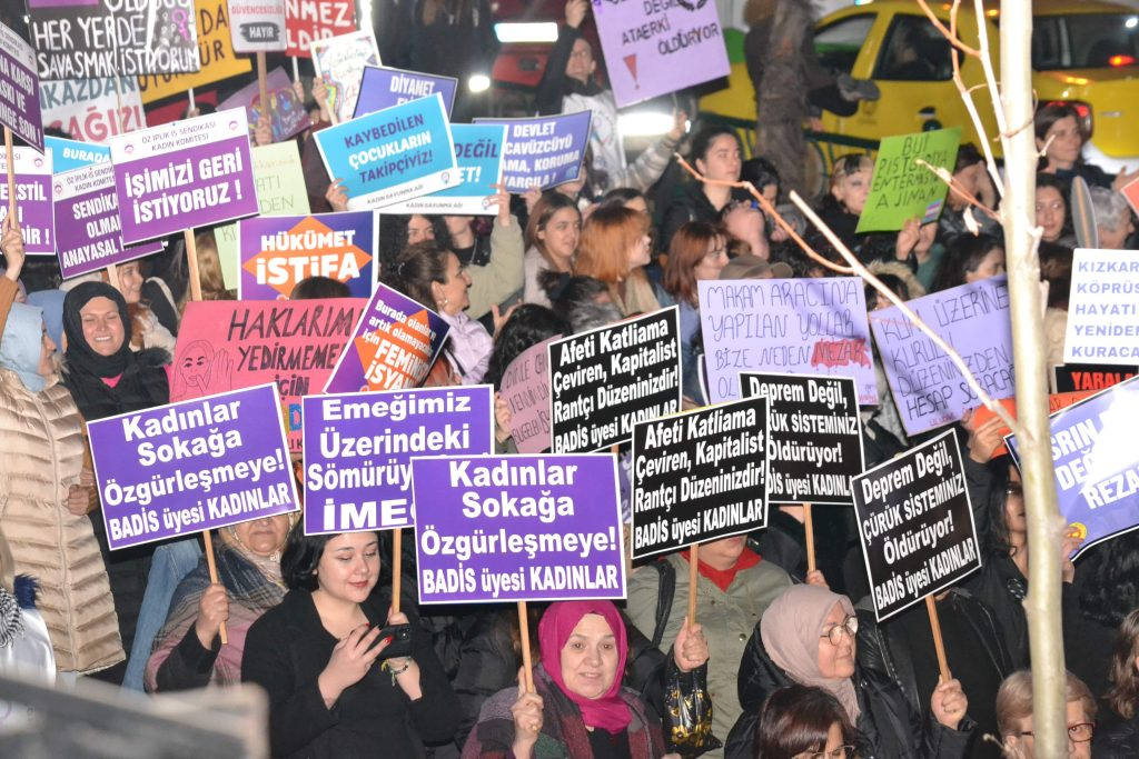 "Bu yıl 8 Mart’a, kadın katliamlarının her gün arttığı, yoksulluk ve açlık sınırının altında yaşamaya mahkum edilen binlerce kadının artan faturalar, barınma ve yaşam masraflarıyla açlığa terk edildiği, LGBT’lere yönelik şiddetin devlet eliyle körüklendiği, kadın işsizliğinin arttığı, savaş politiklarıyla militarizmin cesaretlendirildiği, göçmen kadınlara yönelik ırkçı saldırıların çoğaldığı koşullarda tüm bunlara karşı öfkemizle geldik. Depremde on binleri alınmayan önlemlerle enkaz altında katledenler, yüzbinlerce insanı göçük altında, göndermedikleri yardımlar sebebiyle ölüme terk etti.