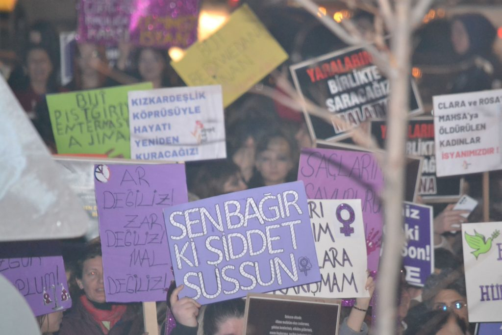 "Yıktığınız hayatları kadın dayanışması ile yeniden kuracağız" sloganıyla sokağa çıkan kadınlar Fomara Meydanı'ndan Kent Meydanı'na yürüdü.