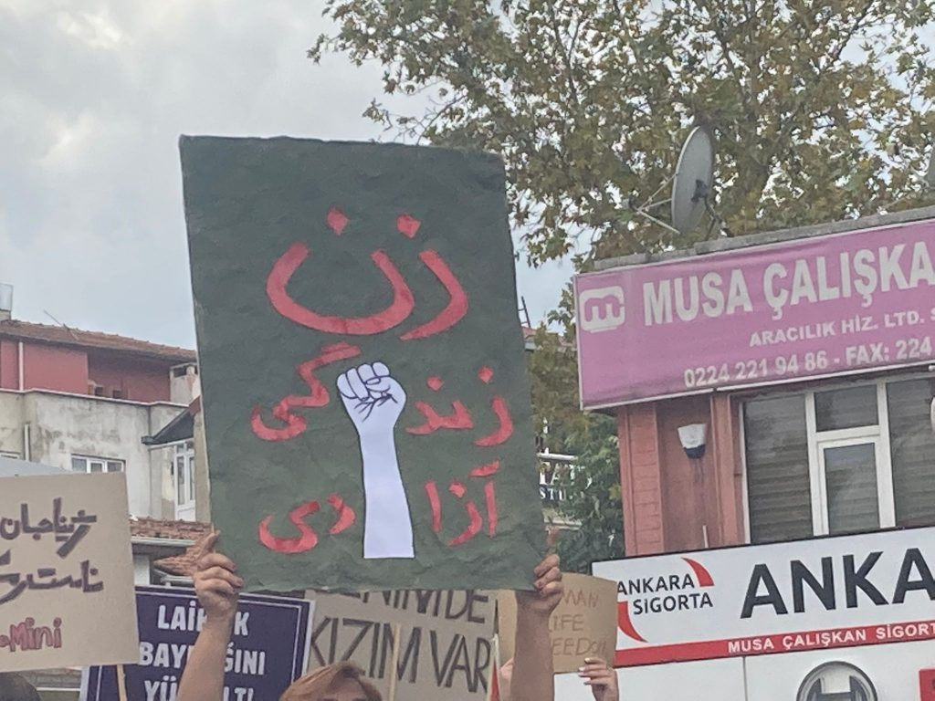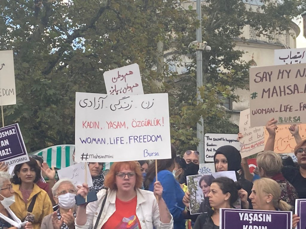 İran’da ahlak polisi tarafından saçının bir kısmı göründüğü gerekçesiyle darbedilerek öldürülen Mahsa Amini için Bursa’da yaşayan kadınlar ortak eylem düzenledi.