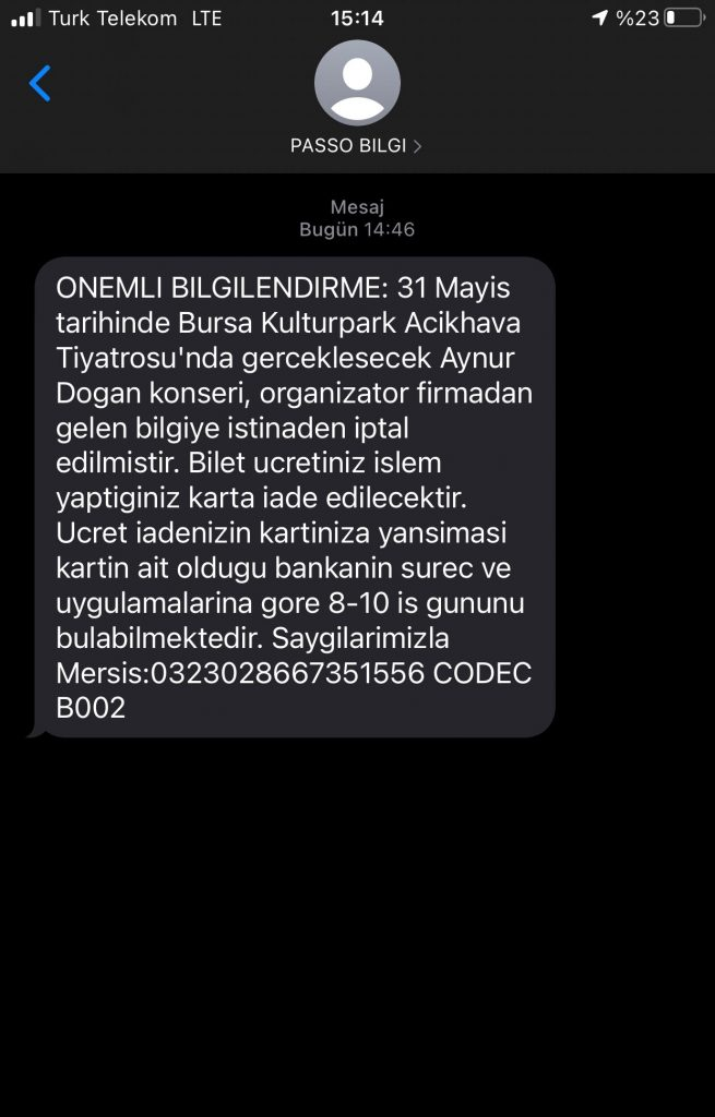 Konser bilet satış organizasyonu olan PASSO, Aynur Doğan konseri için bilet alan seyircilere kısa mesaj ile konserin iptal olduğunu duyurdu.