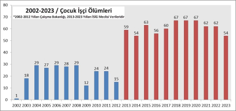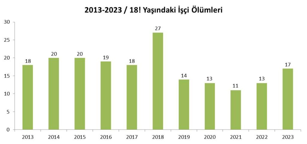 2013 yılında en az 18, 2014 yılında en az 20, 2015 yılında en az 20, 2016 yılında en az 19, 2017 yılında en az 18, 2018 yılında en az 27, 2019 yılında en az 14, 2020 yılında en az 13, 2021 yılında en az 11, 2022 yılında en az 13 ve 2023 yılında en az 17 “on sekiz yaşındaki işçi” hayatını kaybetti...