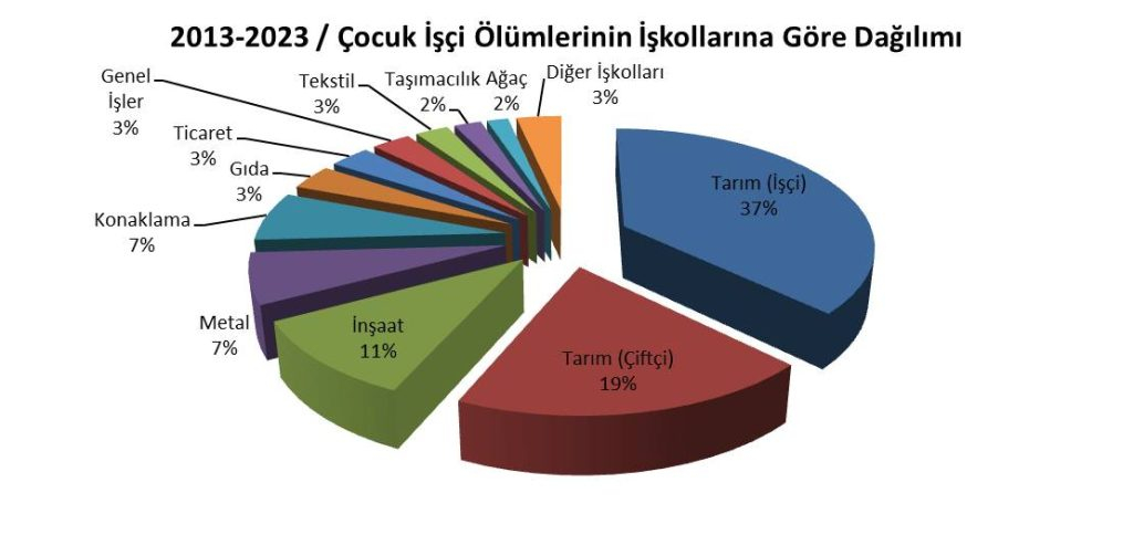 Tarım, Orman işkolunda 380 çocuk (250 işçi ve 130 çiftçi); İnşaat, Yol işkolunda 71 çocuk; Metal işkolunda 46 çocuk; Konaklama, Eğlence işkolunda 45 çocuk; Gıda işkolunda 23 çocuk; Ticaret işkolunda 21 çocuk; Genel İşler işkolunda 20 çocuk; Tekstil, Deri işkolunda 17 çocuk; Taşımacılık işkolunda 14 çocuk; Ağaç, Kâğıt işkolunda 11 çocuk; Kimya, Lastik işkolunda 7 çocuk; Enerji işkolunda 4 çocuk; Çimento, Toprak, Cam işkolunda 3 çocuk; Madencilik işkolunda 1 çocuk; İletişim işkolunda 1 çocuk; Sağlık işkolunda 1 çocuk; Elimizdeki veriler ışığında çalıştığı işkolunu belirleyemediğimiz 6 çocuk işçi çalışırken hayatını kaybetti…